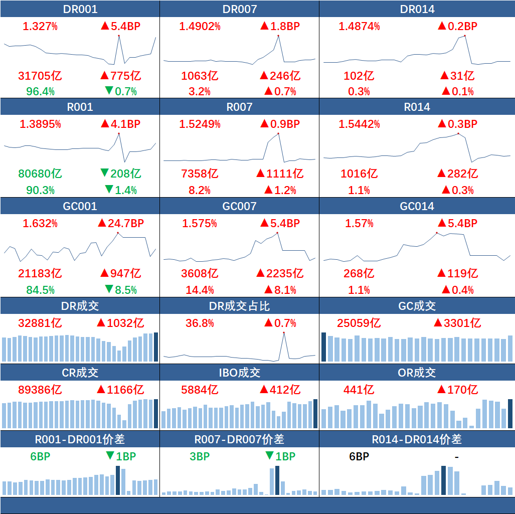 货币市场资金面均衡。今日成交89386亿元。DR001加权1.33%,较前日上行5BP,DR007加权1.49%,较前日上行2BP。